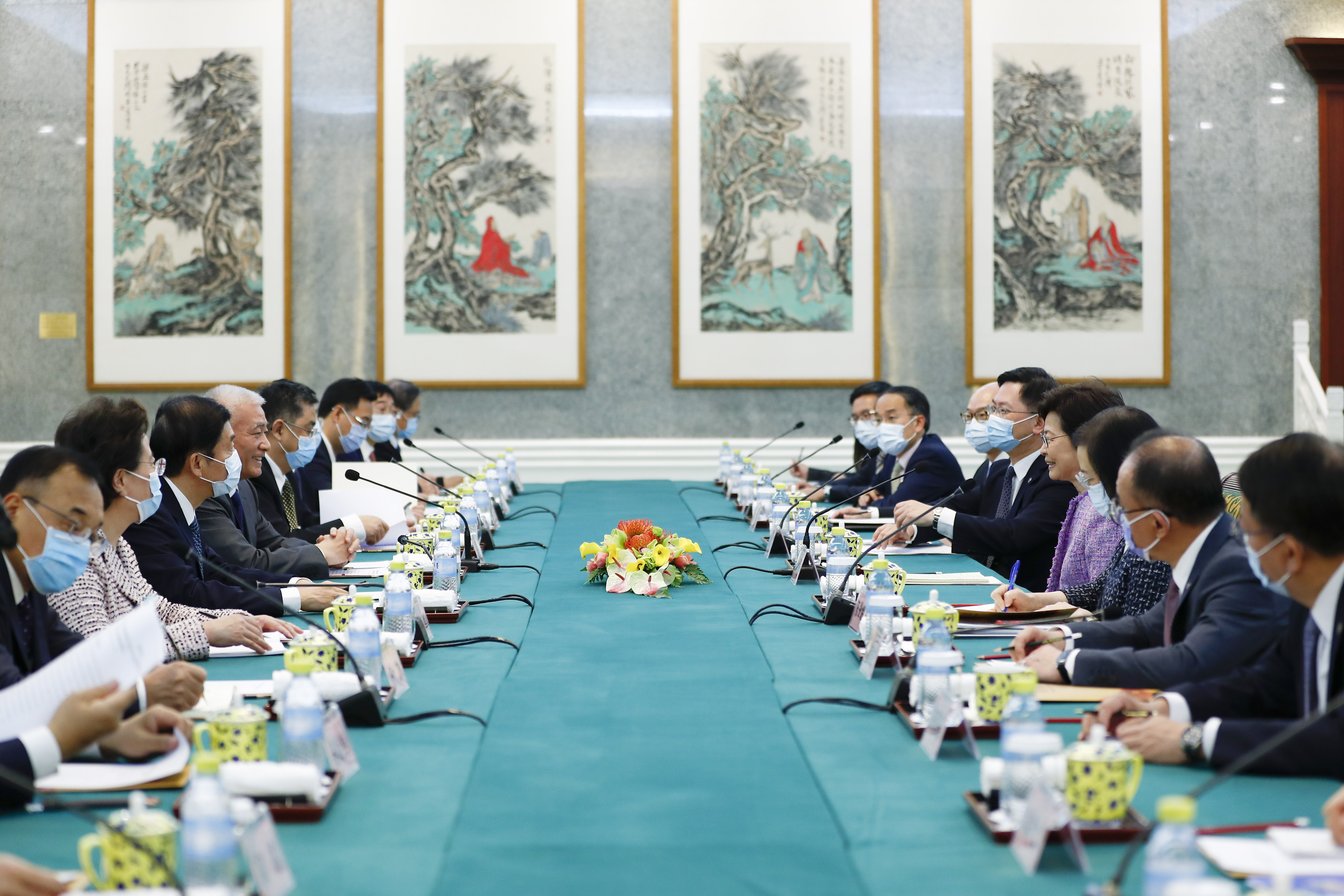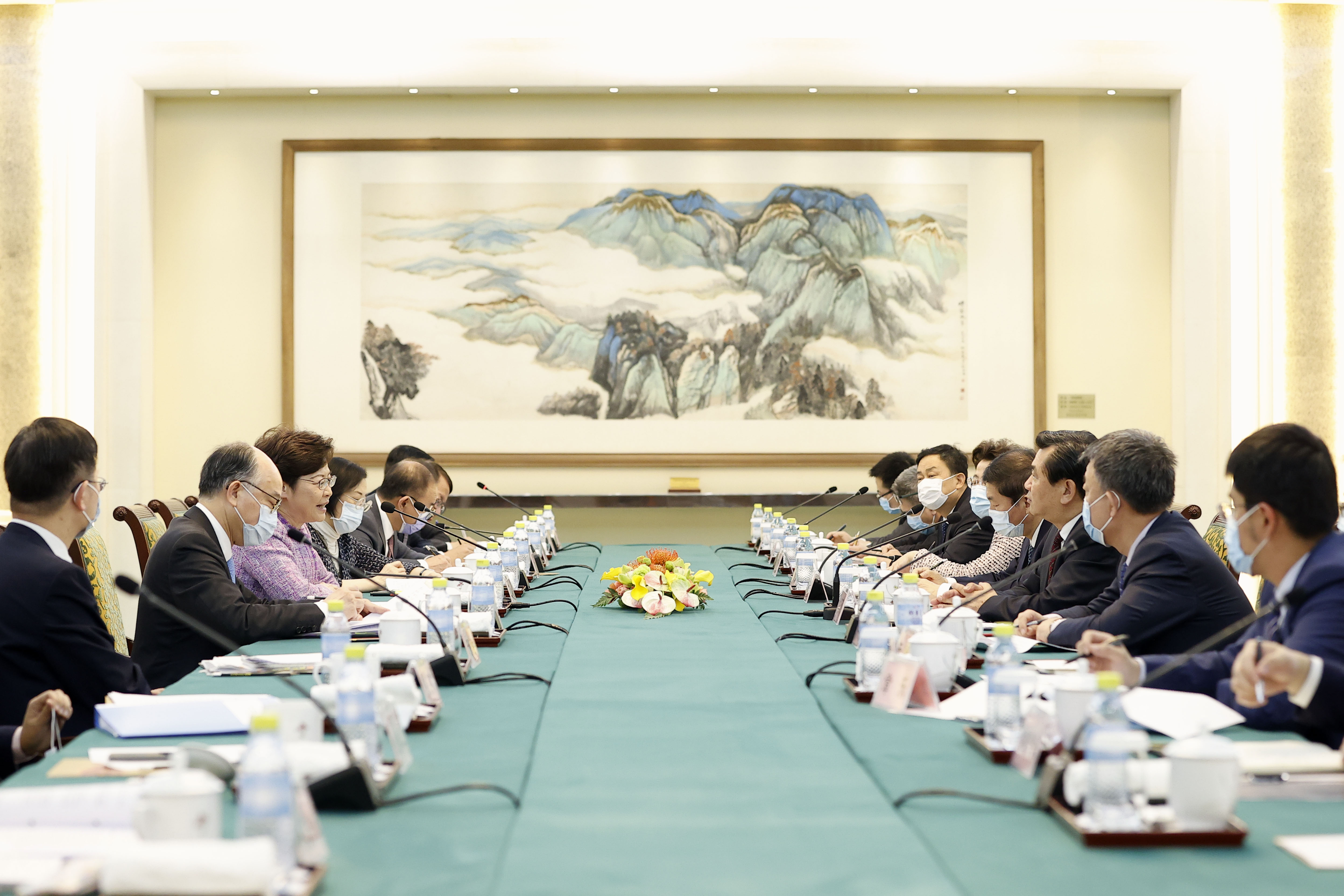 行政长官林郑月娥(左三)今日(十一月四日)在北京与中国民用航空局局长冯正霖(右三)会面。中央人民政府驻香港特别行政区联络办公室主任骆惠宁(右四)、运输及房屋局局长陈帆(左二)、食物及卫生局局长陈肇始教授(左四)、创新及科技局局长薛永恒(左一)、政制及内地事务局局长曾国卫(左五)和行政长官办公室主任陈国基(左六)亦有出席会议。
