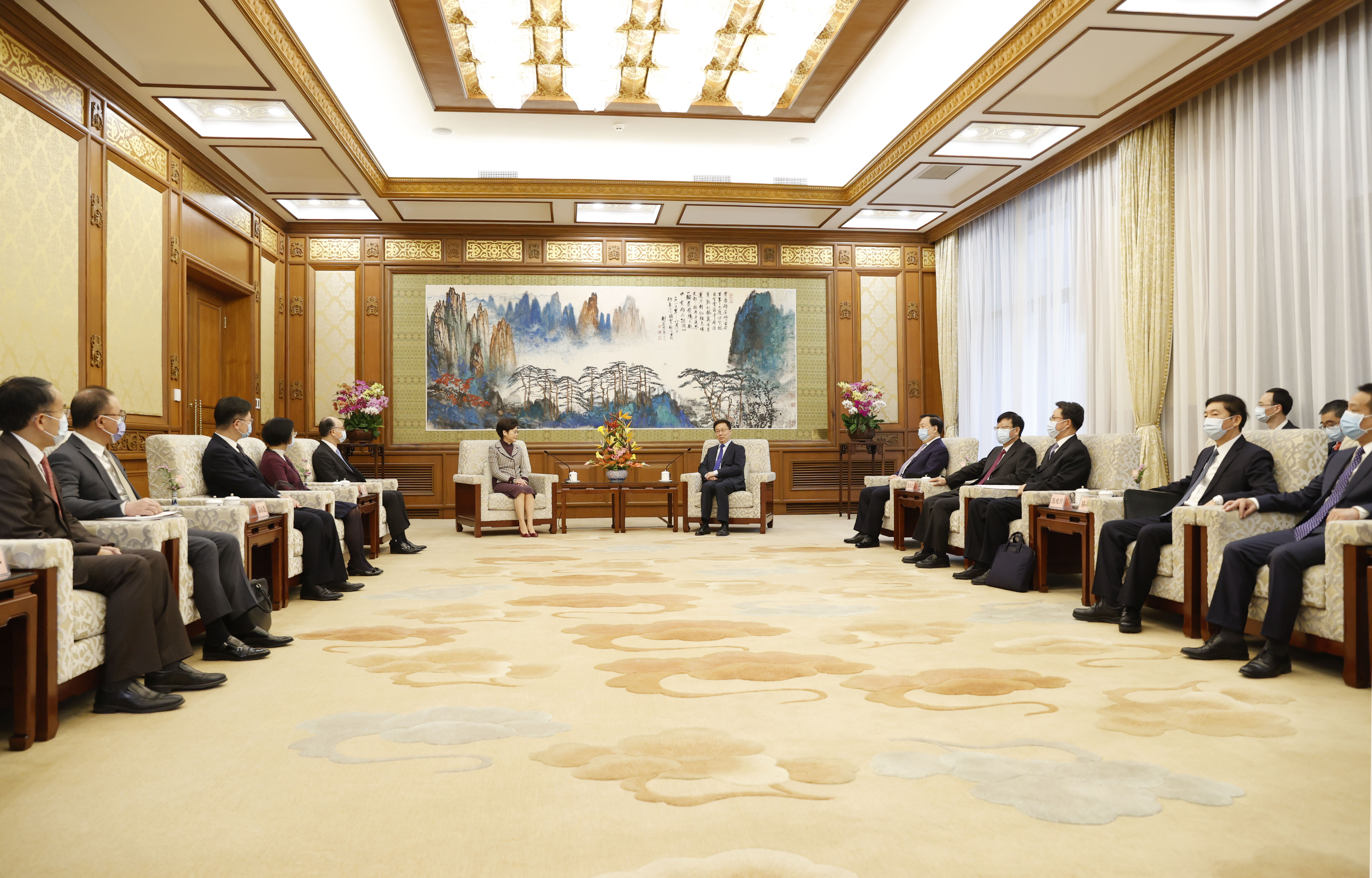 行政长官林郑月娥(左六)今日(十一月六日)上午在北京获国务院副总理韩正(右六)接见。全国政协副主席、国务院港澳事务办公室主任夏宝龙(右五);运输及房屋局局长陈帆(左五);食物及卫生局局长陈肇始教授(左四);创新及科技局局长薛永恒(左三);政制及内地事务局局长曾国卫(左二)和财经事务及库务局局长许正宇(左一)亦有出席。