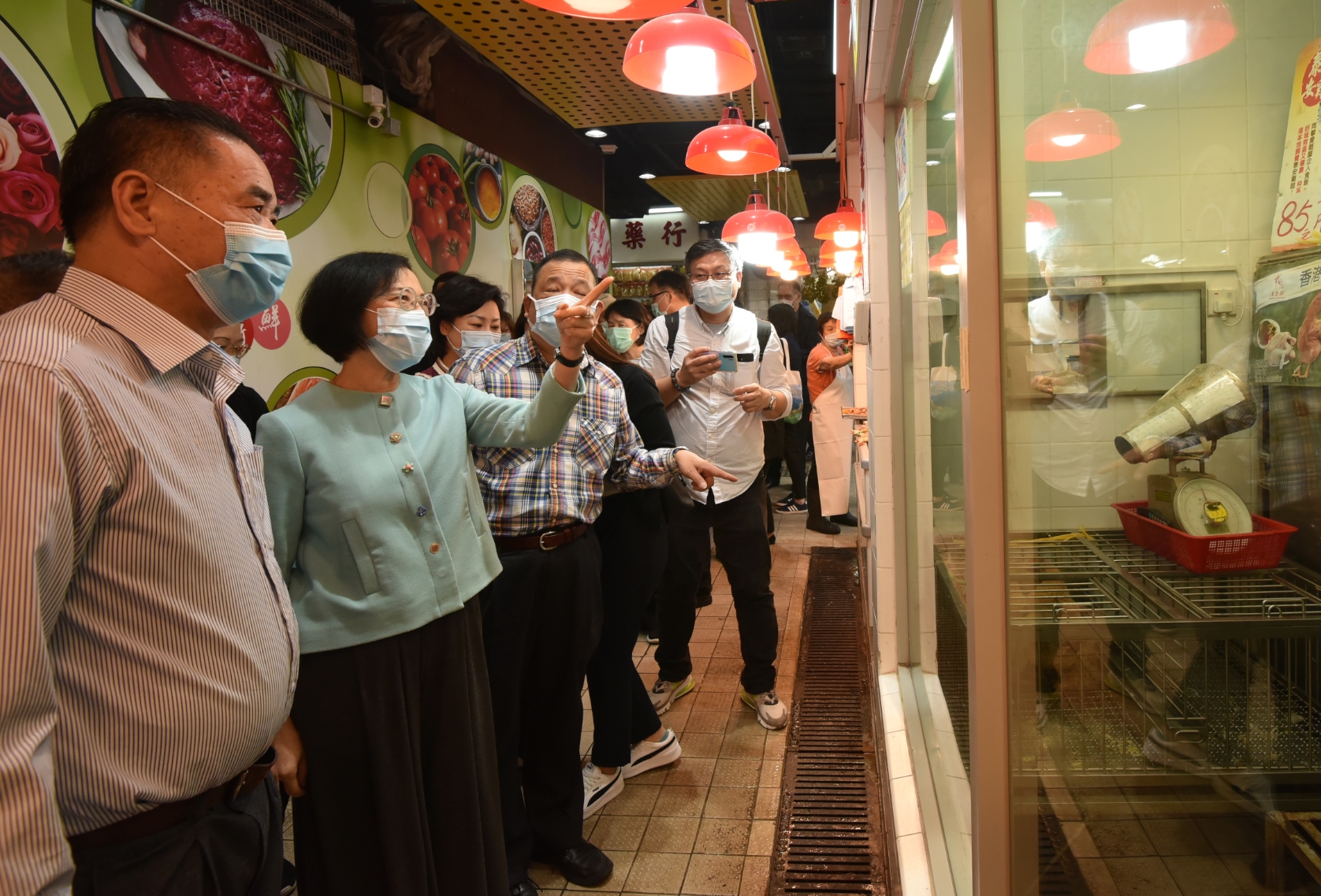 食物及卫生局局长陈肇始教授(左二)今日(十一月十九日)到访大围街市,视察在该街市进行的一系列改善工程,包括重置两个现有的家禽档以达致「人鸡分隔」。