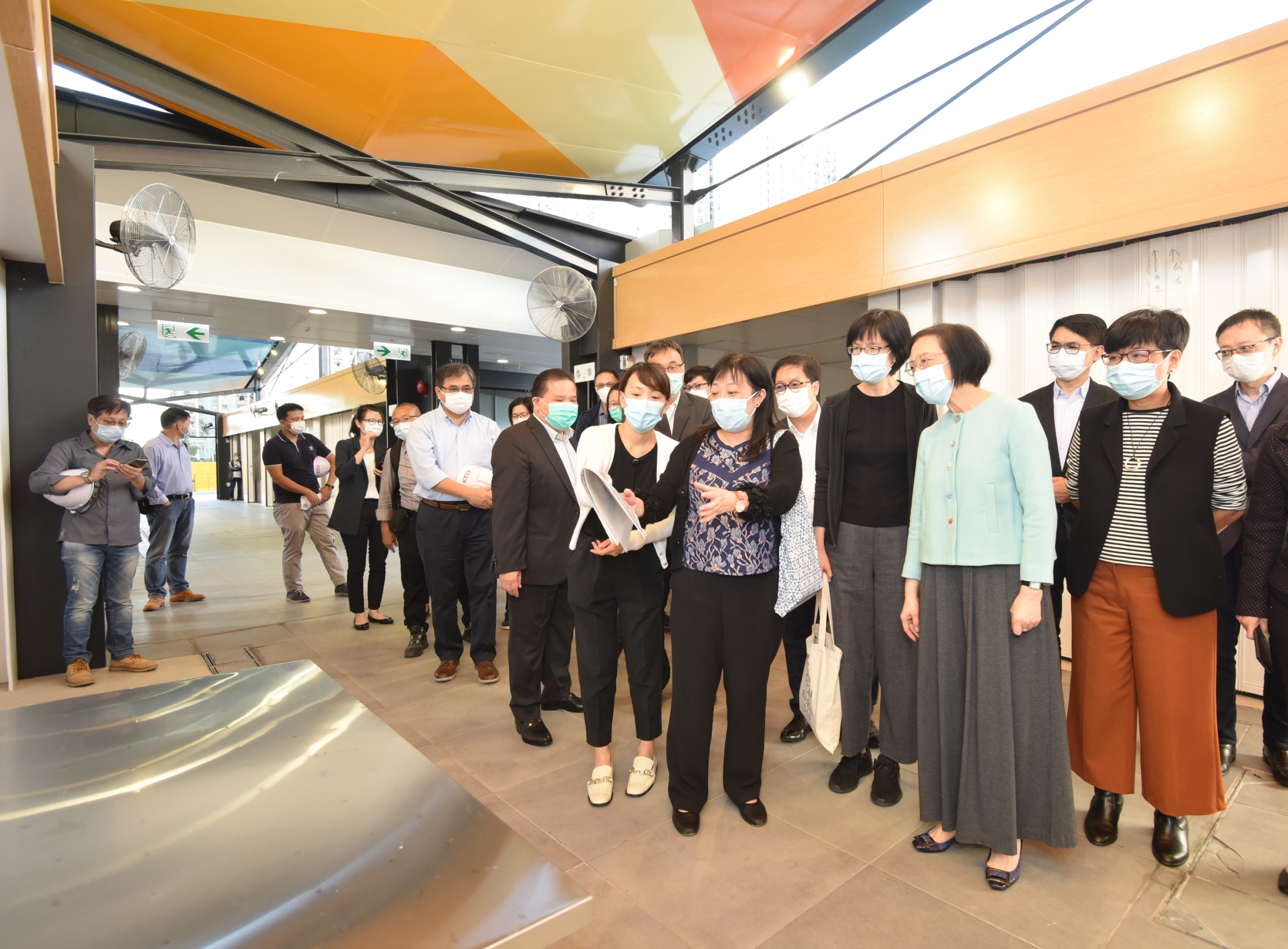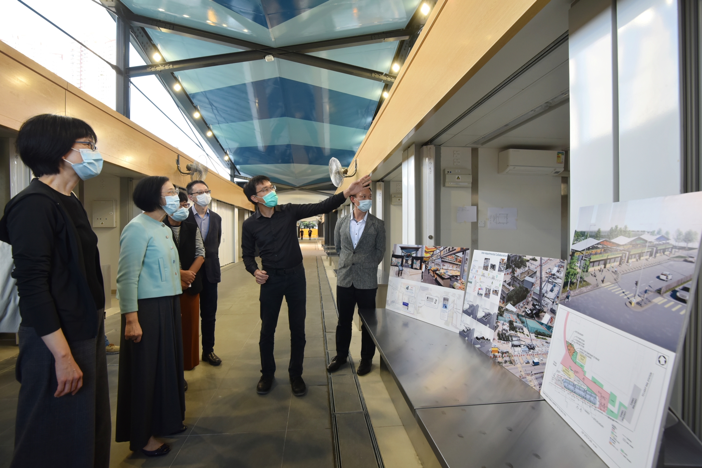 食物及卫生局局长陈肇始教授(右四)今日(十一月十九日)在食物环境卫生署(食环署)署长刘利群(右五)及建筑署署长林余家慧(右二)陪同下,视察位于天水围的食环署天幕街市。