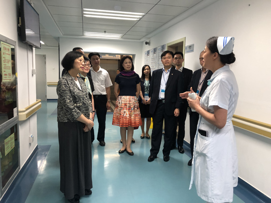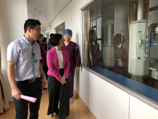 食物及衞生局局長陳肇始教授於八月七日下午率領一百人代表團抵達中山考察,加強粵港澳大灣區在醫療衞生領域的交流與合作。圖示陳肇始教授(中)及考察團成員參觀中山火炬開發區醫院。
