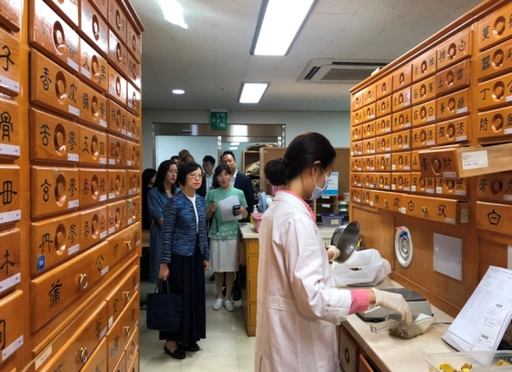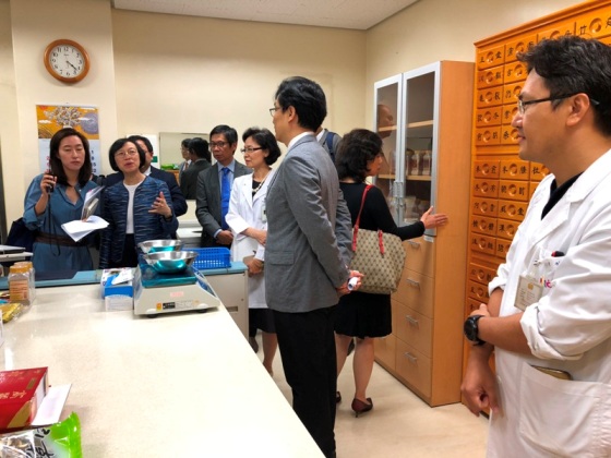 食物及衞生局局長陳肇始教授今日(九月七日)率領代表團繼續訪問首爾。圖示陳肇始教授(左)及代表團參觀江東慶熙大學校病院的韓醫藥房。