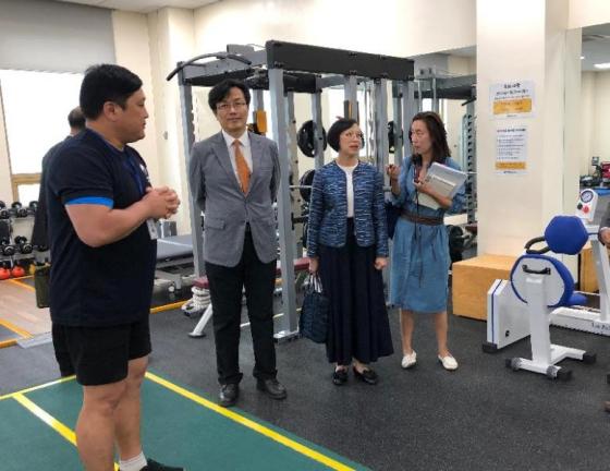 食物及衞生局局長陳肇始教授(右二)今日(九月七日)率領代表團參觀位於首爾的國立再活院的運動室。