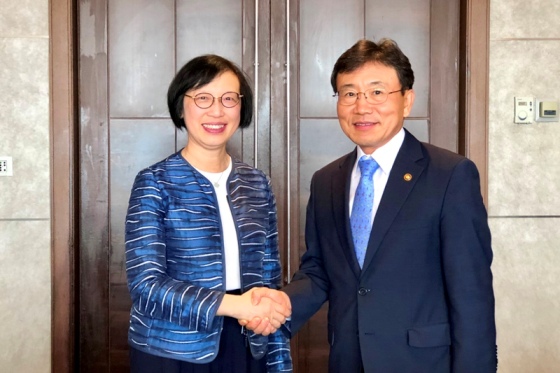食物及衞生局局長陳肇始教授(左)今日(九月七日)在首爾與韓國保健福祉部副部長權德喆(右)會面,就兩地的醫療衞生事宜交換意見。