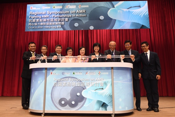 (左起)衞生署衞生防護中心感染控制處主任黃天祐醫生、衞生防護中心總監黃加慶醫生、漁農自然護理署署長梁肇輝博士、衞生署署長陳漢儀醫生、食物及衞生局局長陳肇始教授、食物環境衞生署署長劉利群、香港大學公共衞生學院院長及臨床教授福田敬二教授、食物安全專員何玉賢醫生和衞生防護中心感染控制處顧問醫生(抗菌素耐藥性)吳浩良醫生今日(十一月十三日)主持「抗菌素耐藥性區域研討會」開幕典禮。
