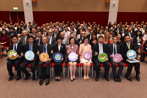 (前排右起)衞生署衞生防護中心感染控制處主任黃天祐醫生、衞生防護中心總監黃加慶醫生、漁農自然護理署署長梁肇輝博士、衞生署署長陳漢儀醫生、食物及衞生局局長陳肇始教授、食物環境衞生署署長劉利群、香港大學公共衞生學院院長及臨床教授福田敬二教授、食物安全專員何玉賢醫生和衞生防護中心感染控制處顧問醫生(抗菌素耐藥性)吳浩良醫生今日(十一月十三日)主持「抗菌素耐藥性區域研討會」開幕典禮,並和與會人士合照。
