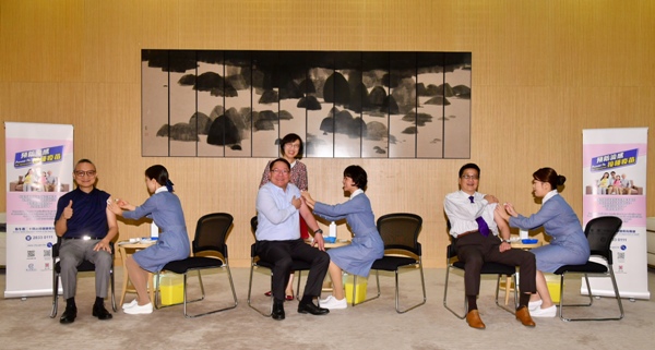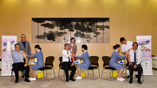 勞工及福利局局長羅致光博士(前排左三)、發展局局長黃偉綸(前排右一)和教育局局長楊潤雄(前排左一)今日(十一月二十一日)一起接種季節性流感疫苗。旁為食物及衞生局局長陳肇始教授(後排中)和食物及衞生局副局長徐德義醫生(後排左)。