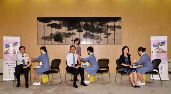 勞工及福利局局長羅致光博士(後排左六)、發展局局長黃偉綸(後排右四)、教育局局長楊潤雄(後排右五)、政制及內地事務局局長聶德權(後排左五)、署理保安局局長區志光(後排右二)、行政長官辦公室主任陳國基(後排左四)、教育局副局長蔡若蓮博士(後排左一)、食物及衞生局副局長徐德義醫生(後排右三)、財經事務及庫務局副局長陳浩濂(後排左二)、民政事務局副局長陳積志(後排左三)和運輸及房屋局副局長蘇偉文博士(後排右一)今日(十一月二十一日)一起接種季節性流感疫苗。食物及衞生局局長陳肇始教授(後排右六)亦到場支持。