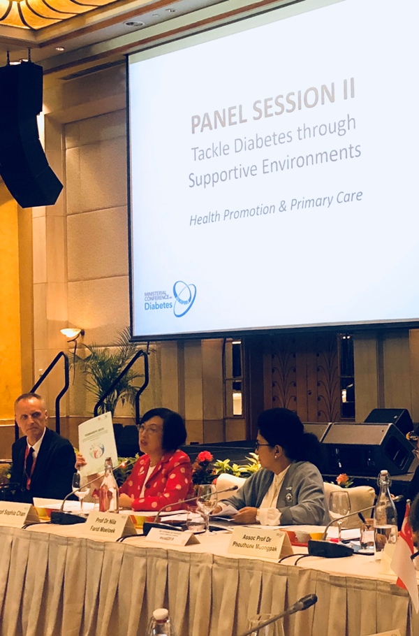 食物及衞生局局長陳肇始教授(中)今日(十一月二十六日)在新加坡出席對抗糖尿病部長會議。圖示陳肇始教授在會議上致辭。