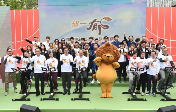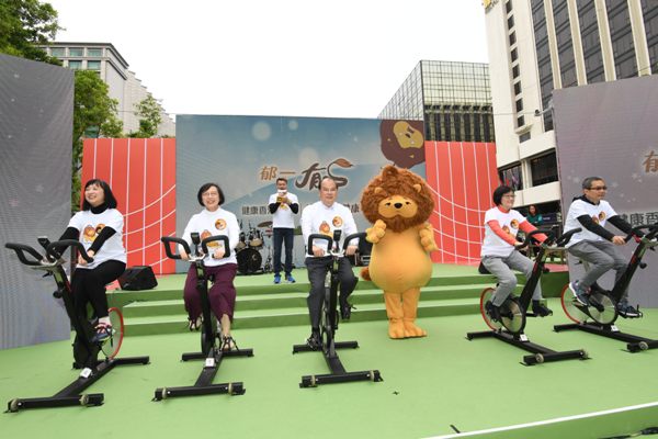 政務司司長張建宗(中)今日(十二月八日)在「健康香港2025 | 郁一郁‧健康啲」宣傳運動啟動禮上,與食物及衞生局局長陳肇始教授(左二)、衞生署署長陳漢儀醫生(右二)、康樂及文化事務署署長李美嫦(左一)及勞工處處長陳嘉信(右一)踏健身單車,向市民推廣健康生活模式。