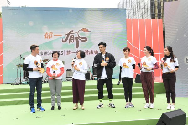食物及衞生局局長陳肇始教授(左三)及衞生署署長陳漢儀醫生(左二)今日(十二月八日)在「健康香港2025 | 郁一郁‧健康啲」宣傳運動啟動禮上,與出席活動的藝人周柏豪(中)及劉心悠(右三)一同宣揚做運動的好處。