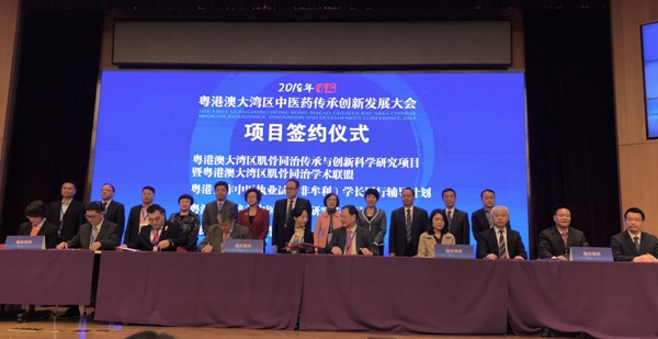 食物及衞生局局長陳肇始教授今日(十二月二十日)率領代表團在深圳出席首屆粵港澳大灣區中醫藥傳承創新發展大會。圖示陳肇始教授(後排右五)、廣東省人民政府副秘書長賀建軍(後排右六)、國家中醫藥管理局國際合作司司長王笑頻(後排右四)、深圳市人民政府副市長吳以環(後排左六)、中央人民政府駐澳門特別行政區聯絡辦公室宣傳文化部部長萬速成(後排左五)及廣東省中醫藥局局長徐慶鋒(後排右三)在會議上見證粵港澳大灣區中醫藥傳承創新發展項目簽約儀式。