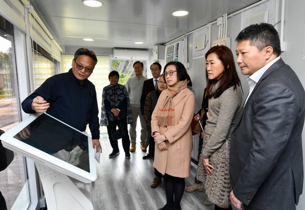 食物環境衞生署職員今日(一月二十二日)向食物及衞生局局長陳肇始教授(右三)介紹新葵涌紀念花園電子屏幕的運作,電子屏幕方便市民悼念先人。