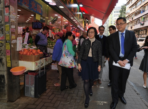 食物及衞生局局長陳肇始教授(右二)今日(一月二十九日)視察九龍城道、上鄉道及下鄉道一帶環境衞生情況。旁為九龍城民政事務專員郭偉勳(右一)。