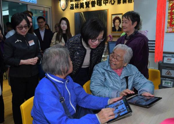 食物及衞生局局長陳肇始教授(右二)今日(一月二十九日)參觀保良局溫林美賢耆暉中心,了解中心的運作。