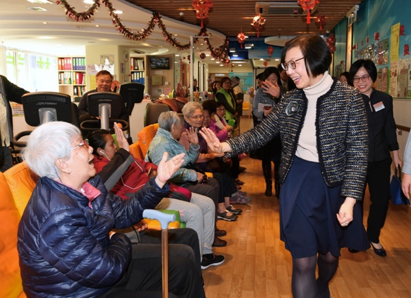 食物及衞生局局長陳肇始教授(中)今日(一月二十九日)參觀保良局溫林美賢耆暉中心,並與中心的長者交談。