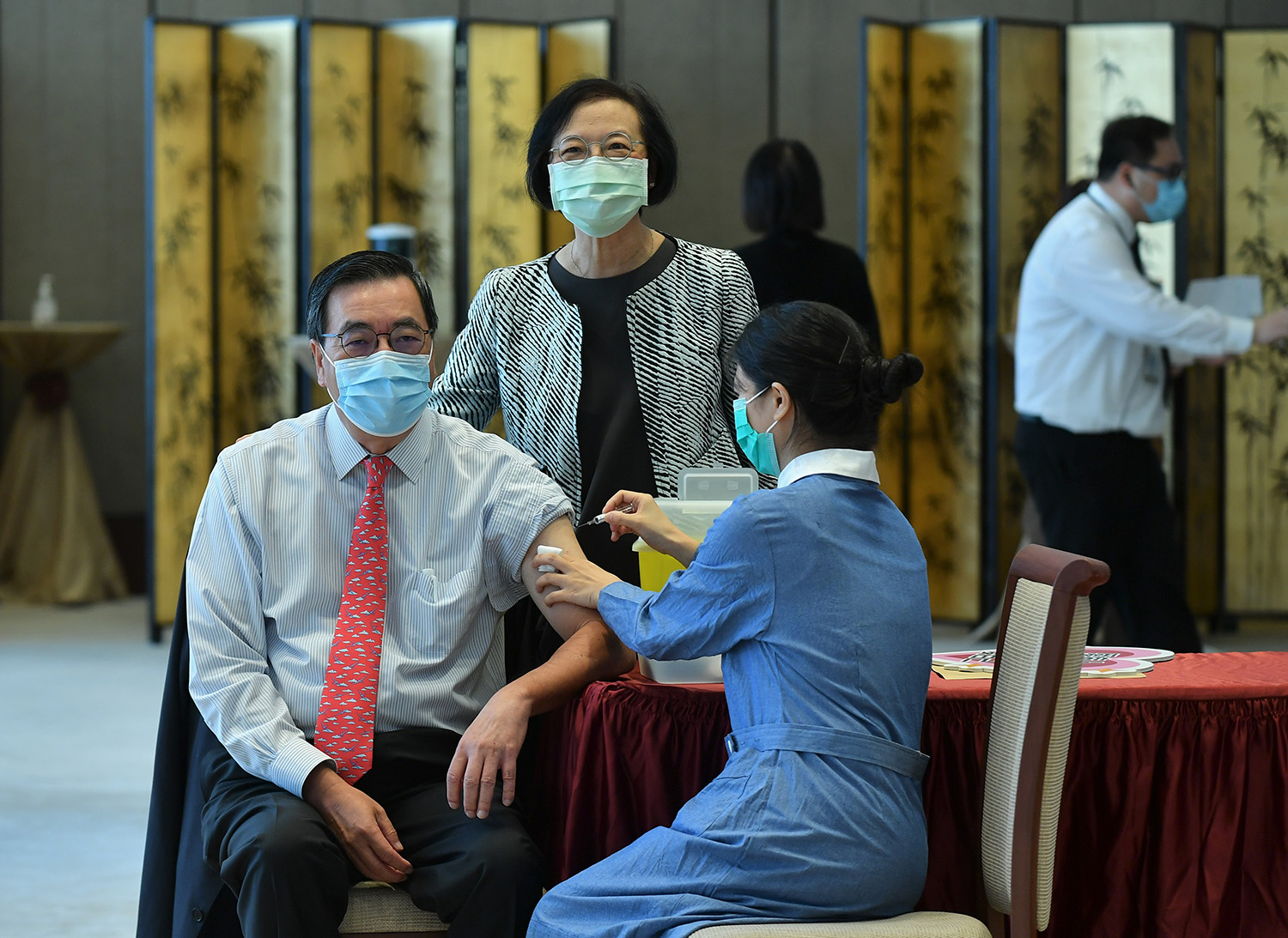 立法會主席梁君彥(左)今日(十月二十八日)接種季節性流感疫苗。旁為食物及衞生局局長陳肇始教授(中)。