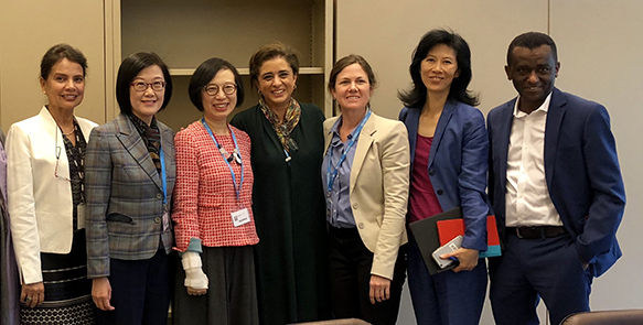 食物及衞生局局長陳肇始教授今日(日內瓦時間五月二十一日)繼續在瑞士日內瓦出席世界衞生組織第七十二屆世界衞生大會,並藉此機會與會員國的高層衞生官員就衞生事宜作交流。圖示陳肇始教授(左三)及衞生署署長陳漢儀醫生(左二)與世界衞生組織抗微生物藥物耐藥性事務助理總幹事Hanan Balkhy教授(中)及她的團隊合照。