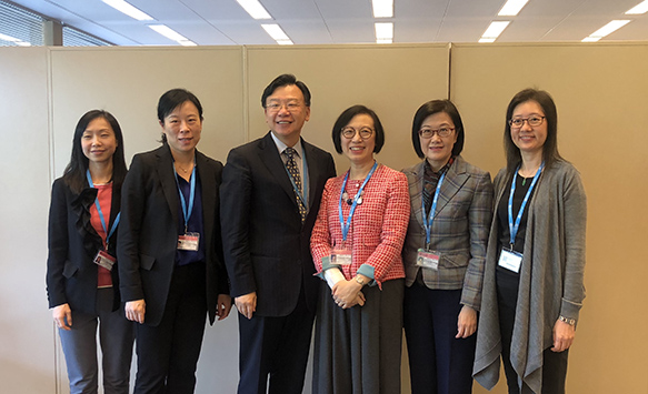 食物及衞生局局長陳肇始教授今日(日內瓦時間五月二十一日)繼續在瑞士日內瓦出席世界衞生組織第七十二屆世界衞生大會,並藉此機會與會員國的高層衞生官員就衞生事宜作交流。圖示陳肇始教授(左二)及衞生署署長陳漢儀醫生(右二)與新加坡衞生部部長顏金勇(中)及其團隊合照。