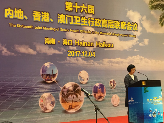 The Secretary for Food and Health, Professor Sophia Chan, led a delegation to Haikou to attend the 16th Joint Meeting of Senior Health Officials of the Mainland, Hong Kong and Macao organised by National Health, Family and Planning Commission on December 4. The meeting provides a platform for senior medical and health officials and experts of the Mainland, Hong Kong and Macao to share experiences and exchange views on public health issues. Picture shows Professor Chan (6th from left, front row) taking photos with other participants at the opening ceremony of the meeting. Looking on is the Minister of the National Health and Family Planning Commission, Ms Li Bin (7th from left, front row) and the Governor of Hainan Province, Mr Shen Xiaoming (7th from right).