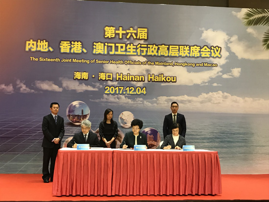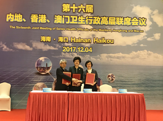 Professor Chan (first right) signed a co-operation agreement on healthcare training in response to the ageing population. Also present are the Minister of the National Health and Family Planning Commission, Ms Li Bin (centre), and the Director of the Health Bureau of the Macao Special Administrative Region Government, Dr Lei Chin-ion (first left).