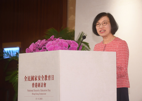 The Secretary for Food and Health, Professor Sophia Chan, introduced initiatives taken by the Food and Health Bureau in ensuring food and health safety at the National Security Education Day Hong Kong Symposium on April 15.