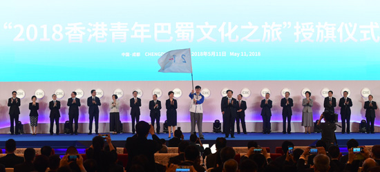 The Chief Executive, Mrs Carrie Lam, attended the Hong Kong-Sichuan Exchange Conference on Investment and Trade Co-operation in Chengdu on May 11. Photo shows Mrs Lam (ninth left) and the Secretary of the CPC Sichuan Provincial Committee, Mr Peng Qinghua (eighth right), officiating at the flag presentation ceremony of "Ba-Shu Cultural Exchange for Young People of Hong Kong". Also pictured are the Chief Secretary for Administration, Mr Matthew Cheung Kin-chung (eight left); the Secretary for Constitutional and Mainland Affairs, Mr Patrick Nip (seventh left); the Secretary for Food and Health, Professor Sophia Chan (sixth left); the Secretary for Development, Mr Michael Wong (fifth left); the Director of the Chief Executive's Office, Mr Chan Kwok-ki (fourth left); the Under Secretary for Innovation and Technology, Dr David Chung (third left); the Under Secretary for Education, Dr Choi Yuk-lin (second left); the Under Secretary for Home Affairs, Mr Jack Chan (first left); and the Director of the Liaison Office of the Central People's Government in the Hong Kong Special Administrative Region, Mr Wang Zhimin (seventh right).