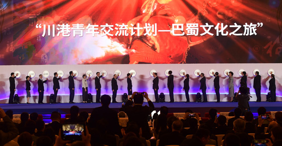 The Chief Executive, Mrs Carrie Lam, attended the Hong Kong-Sichuan Exchange Conference on Investment and Trade Co-operation in Chengdu on May 11. Photo shows Mrs Lam (ninth left); the Secretary of the CPC Sichuan Provincial Committee, Mr Peng Qinghua (ninth right); the Chief Secretary for Administration, Mr Matthew Cheung Kin-chung (eight left); the Secretary for Constitutional and Mainland Affairs, Mr Patrick Nip (seventh left); the Secretary for Food and Health, Professor Sophia Chan (sixth left); the Secretary for Development, Mr Michael Wong (fifth left); the Director of the Chief Executive's Office, Mr Chan Kwok-ki (fourth left); the Under Secretary for Innovation and Technology, Dr David Chung (third left); the Under Secretary for Education, Dr Choi Yuk-lin (second left); the Under Secretary for Home Affairs, Mr Jack Chan (first left); and other guests officiating at the launch ceremony of the programme on "Ba-Shu Cultural Exchange for Young People of Hong Kong".