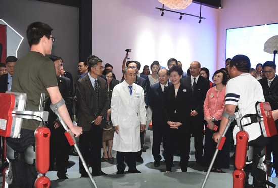 The Chief Executive, Mrs Carrie Lam, visited the University of Electronic Science and Technology of China in Chengdu on May 12. Photo shows Mrs Lam (fifth right); the Chief Secretary for Administration, Mr Matthew Cheung Kin-chung (sixth right); and the Secretary for Food and Health, Professor Sophia Chan (third right), receiving a briefing on the assistive device for paralysed patient.