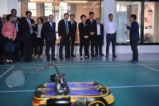 The Chief Executive, Mrs Carrie Lam, visited the University of Electronic Science and Technology of China (UESTC) in Chengdu on May 12. Photo shows Mrs Lam (fifth right); the Chief Secretary for Administration, Mr Matthew Cheung Kin-chung (fifth left); the Secretary for Food and Health, Professor Sophia Chan (first left); the Secretary for Development, Mr Michael Wong (second left); the Secretary for Constitutional and Mainland Affairs, Mr Patrick Nip (sixth right); the Director of the Chief Executive's Office, Mr Chan Kwok-ki (third left); the Party Secretary of UESTC, Mr Wang Yafei (sixth left); and the Deputy Secretary-General of the Sichuan Provincial Government, Mr Chen Lijiang (fourth right), receiving a briefing on the badminton robot.