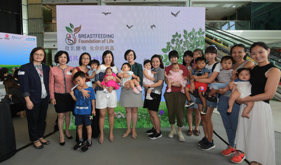 The Secretary for Food and Health, Professor Sophia Chan (back row, fifth left), and the Deputy Director of Health, Dr Amy Chiu (back row, first left), join a group photo with breastfeeding mothers and breastfed children at a celebration event for World Breastfeeding Week 2018 on July 26.