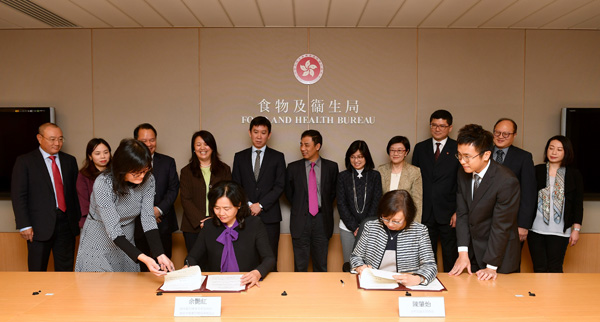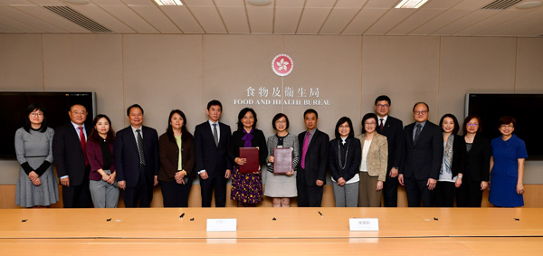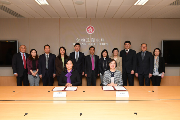 The Secretary for Food and Health of the HKSAR Government, Professor Sophia Chan, and Party Group Member of the National Health Commission cum Party Secretary and Vice Commissioner of the National Administration of Traditional Chinese Medicine (NATCM), Professor Yu Yanhong, signed a co-operation agreement on Chinese medicine at the Central Government Offices this morning (October 26). The Permanent Secretary for Food and Health (Health), Ms Elizabeth Tse (back row, seventh left); the Deputy Director-General of the Co-ordination Office of the Liaison Office of the Central People’s Government in the HKSAR, Mr Zhang Qiang (back row, sixth left); the Director of Health, Dr Constance Chan (back row, eighth left); the Deputy Director-General of the Department of International Cooperation, NATCM, Mr Zhu Haidong (back row, fifth left); the Director (Cluster Services) of the Hospital Authority, Dr Tony Ko (back row, ninth left); the Deputy Director-General of the General Office, NATCM, Dr Li Yachan (back row, fourth left); the Deputy Secretary for Food and Health (Health), Mr Howard Chan (back row, 10th left); the Director of the Bureau of Traditional Chinese Medicine of Guangdong Province, Mr Xu Qingfeng (back row, third left); the Head (Chinese Medicine Unit) of the Food and Health Bureau, Miss Grace Kwok (back row, first right); the Program Officer of the General Office, NATCM, Ms Chen Huang (back row, second left); and the Hong Kong Representative of the National Health Commission, Mr Bi Wenhan (back row, first left), attended the signing ceremony.