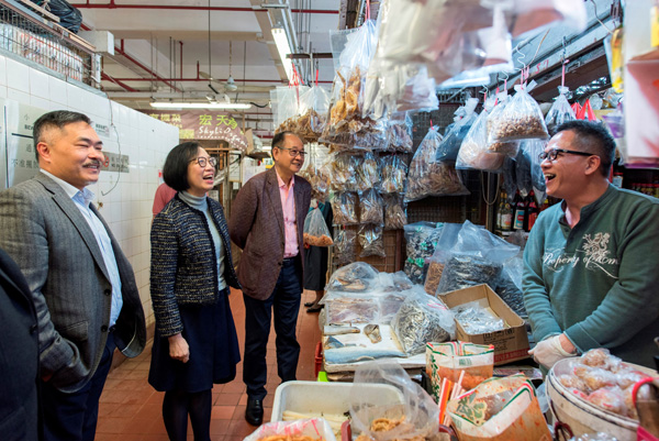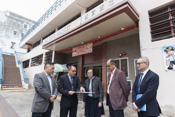 The Secretary for Food and Health, Professor Sophia Chan, today (February 19) visited Sai Kung Market. Photo shows staff of the Food and Environmental Hygiene Department briefing Professor Chan (centre) on the feasibility of installing elevators and an escalator in the market.