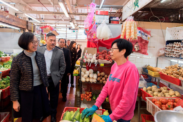 The Secretary for Food and Health, Professor Sophia Chan (second left), visited Sai Kung District today (February 19), where she is pictured viewing the environmental hygiene conditions at Sai Kung Market.