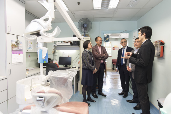 The Secretary for Food and Health, Professor Sophia Chan, visited Sai Kung District today (February 19). Photo shows Professor Chan (first left) visiting the Mona Fong Dental Clinic in Sai Kung to learn more about its services and facilities.
