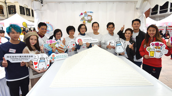 The Secretary for Food and Health, Professor Sophia Chan, and the Chairman of the Committee on Reduction of Salt and Sugar in Food, Mr Bernard Chan, attended a promotional event entitled "Salt & Sugar Reduction Day" today (February 23). Photo shows Professor Chan (sixth left), Mr Chan (seventh left), the Director of Health, Dr Constance Chan (fourth left), the Director of Food and Environmental Hygiene, Miss Vivian Lau (fifth left) and the Permanent Secretary for Food and Health (Food), Mr Philip Yung (eighth left), building a sugar cube pyramid together with other guests to achieve a world record.