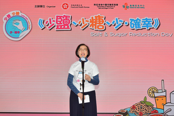 The Secretary for Food and Health, Professor Sophia Chan,attended a promotional event entitled "Salt & Sugar Reduction Day" today (February 23). Photo shows Professor Chan delivering a speech at the launch ceremony.