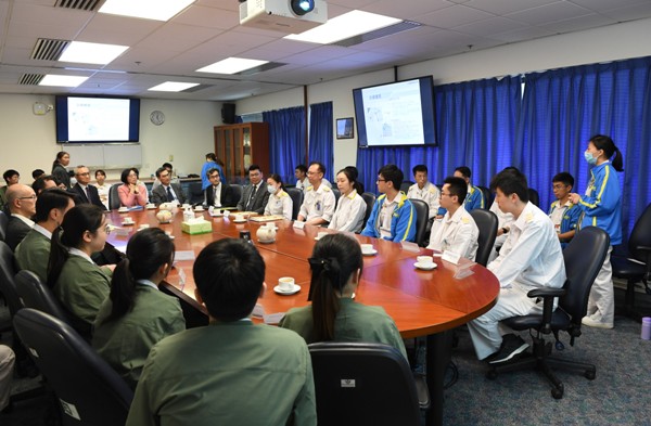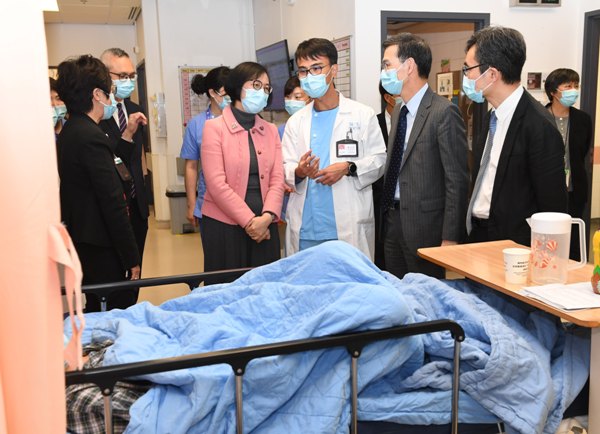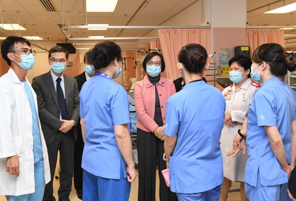 The Secretary for Food and Health, Professor Sophia Chan (second right), today (March 13) visits North District Hospital to exchange views with front-line healthcare professionals.
