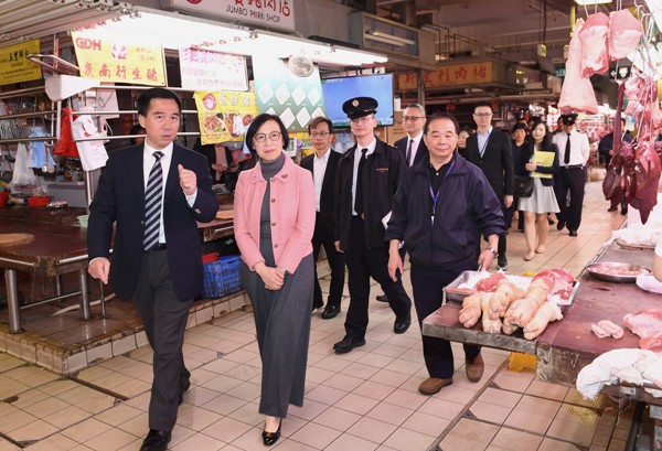 The Secretary for Food and Health, Professor Sophia Chan (second left), today (March 13) visits Luen Wo Hui Market and is briefed by staff of the Food and Environmental Hygiene Department on the improvement works of the market.