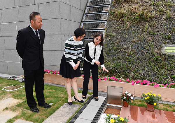 Accompanied by the Deputy Director of Food and Environmental Hygiene (Environmental Hygiene), Miss Diane Wong (centre), the Secretary for Food and Health, Professor Sophia Chan (right), today (April 10) viewed the Garden of Forever Love, the first facility for keeping abortuses of less than 24 weeks' gestation managed by the Food and Environmental Hygiene Department.