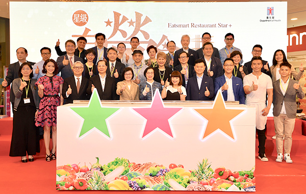 The Secretary for Food and Health, Professor Sophia Chan (centre), and the Director of Health, Dr Constance Chan (third left), officiate at the launch ceremony for the Department of Health’s EatSmart Restaurant Star + Campaign today (May 2).