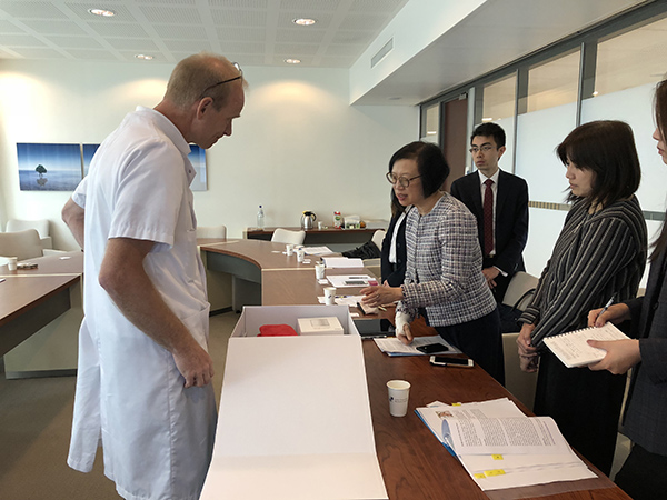 The Secretary for Food and Health, Professor Sophia Chan, today (May 17, Netherlands time) visited the Netherlands to learn more about the country's latest developments in primary healthcare services. Picture shows Professor Chan (third left) listening to a presentation by Professor Douwe Atsma (first right) on the primary healthcare services in the Netherlands during a visit to Leiden University Medical Centre.