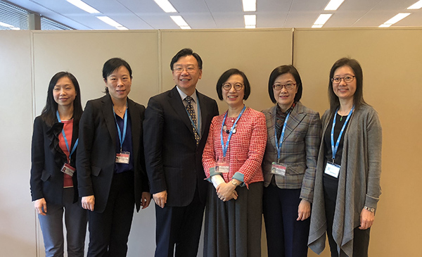The Secretary for Food and Health, Professor Sophia Chan, today (May 21, Geneva time) continued to attend the 72nd World Health Assembly of the World Health Organization (WHO) in Geneva, Switzerland, and took the opportunity to exchange views on healthcare-related issues with senior health officials of member states. Professor Chan (second left) and the Director of Health, Dr Constance Chan (second right), are pictured with the Minister for Health of Singapore, Mr Gan Kim Yong (centre) and his team.