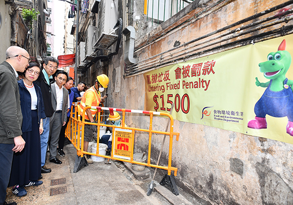 The Secretary for Food and Health, Professor Sophia Chan (second left), visits Sham Shui Po today (May 23) to inspect the anti-rodent improvement work at a rear lane conducted by the Highways Department.