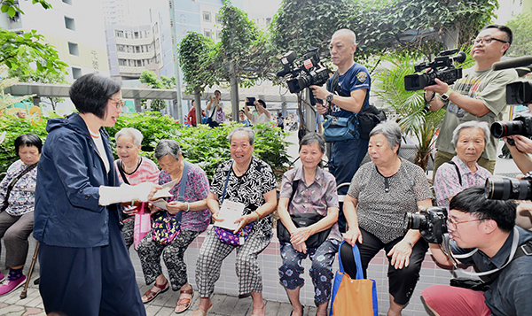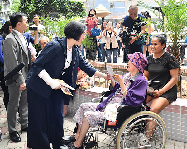 The Secretary for Food and Health, Professor Sophia Chan (left), today (May 23) chats with residents in Un Chau Estate to learn about the situation of rodent infestation in the estate and reminds them of the importance of rodent prevention and control.