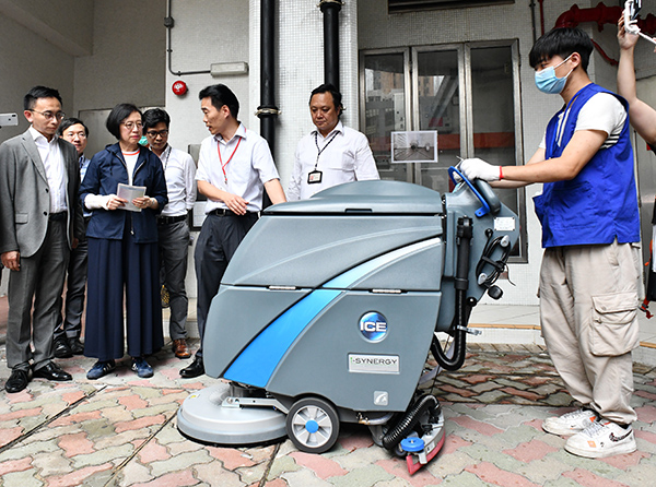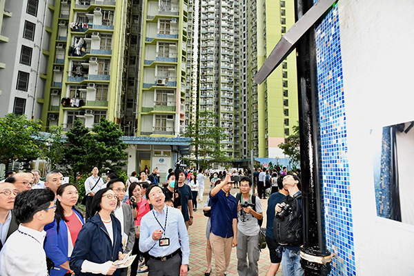 The Secretary for Food and Health, Professor Sophia Chan (third left), visits Un Chau Estate to learn about the cleaning work conducted by the Housing Department today (May 23).