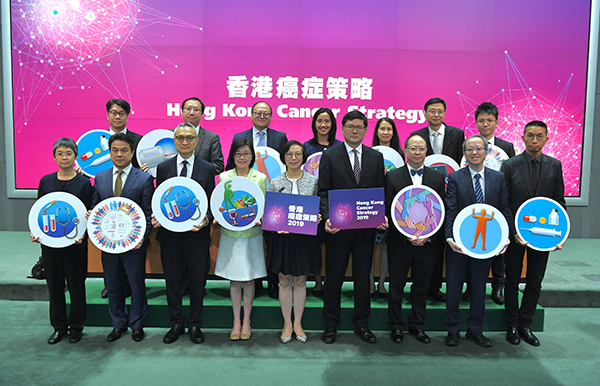 The Secretary for Food and Health, Professor Sophia Chan (centre); the Director of Health, Dr Constance Chan (second left); the Director (Cluster Services) of the Hospital Authority, Dr Tony Ko (second right); the Chief Scientific Reviewer of the Research Office of the Food and Health Bureau, Dr Edmond Ma (first left); and the Director of the Hong Kong Cancer Registry, Dr Wong Kam-hung (first right), unveil the Hong Kong Cancer Strategy today (July 26).