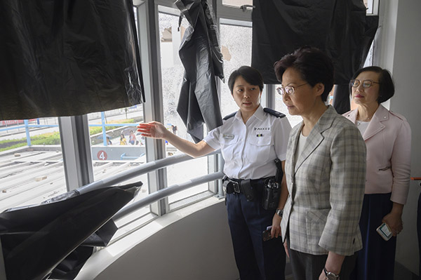 English Caption The Chief Executive, Mrs Carrie Lam (centre), accompanied by the Secretary for Food and Health, Professor Sophia Chan (right), visited the Tin Shui Wai Police Station today (August 7) to learn more about the damage to its facilities and meet the police officers of the district.