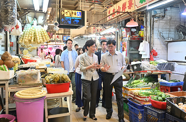 English Caption The Chief Executive, Mrs Carrie Lam (left, front row), accompanied by the Secretary for Food and Health, Professor Sophia Chan, visited Tai Wai Market today (August 7) to learn about the progress of improvement works.