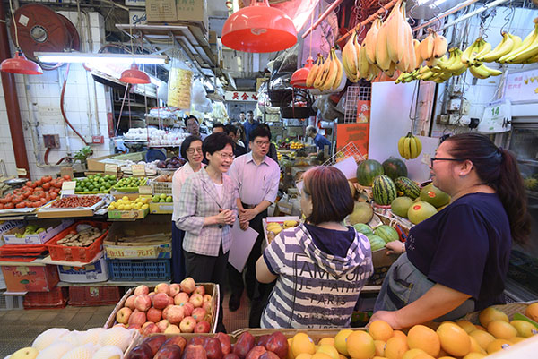 English Caption The Chief Executive, Mrs Carrie Lam (second left), accompanied by the Secretary for Food and Health, Professor Sophia Chan (first left), visited Tai Wai Market today (August 7) to learn about the progress of improvement works. Photo shows Mrs Lam chatting with stall operators.